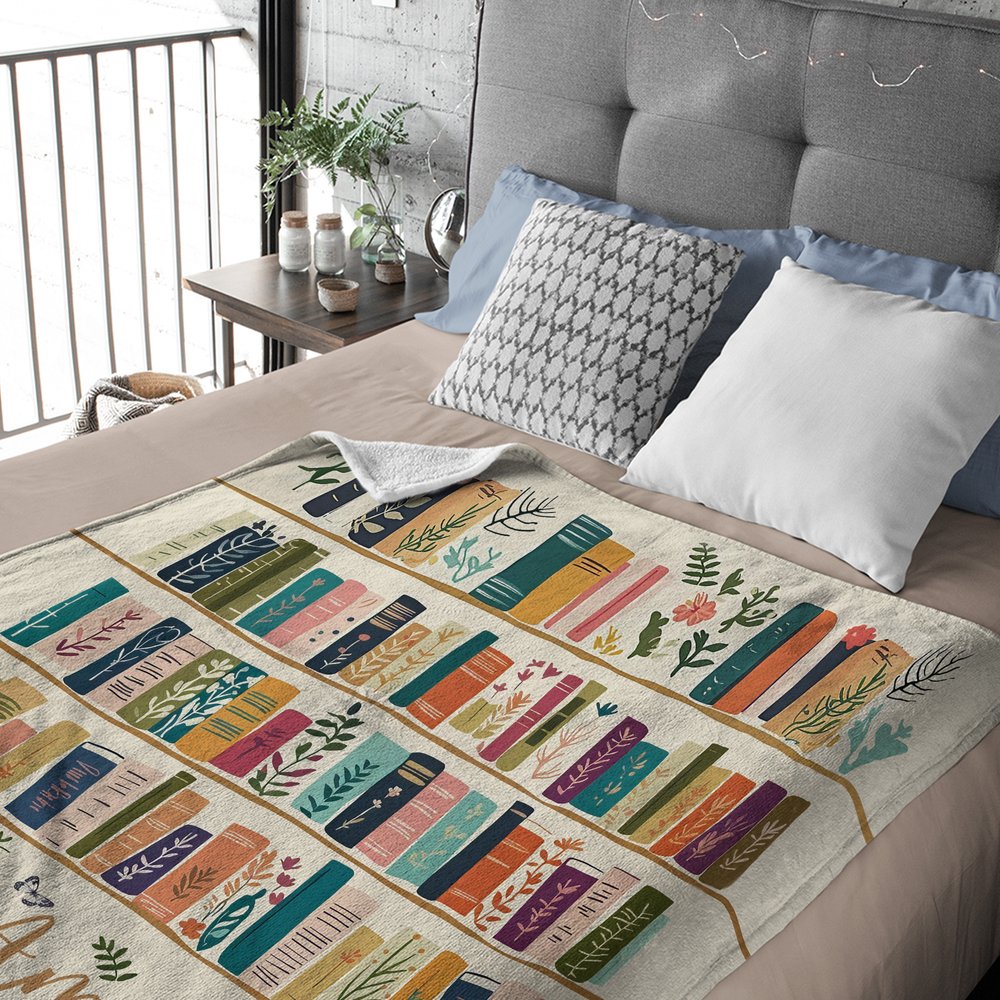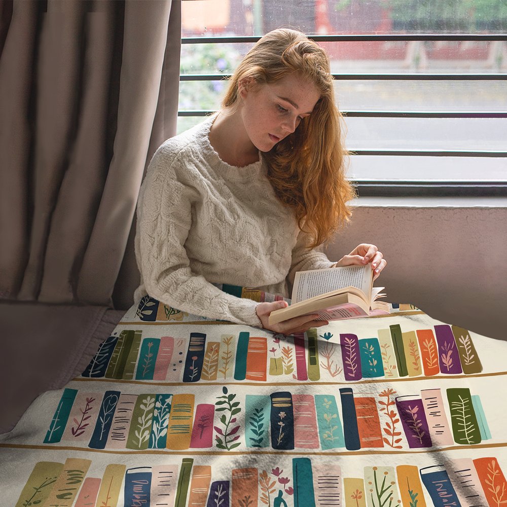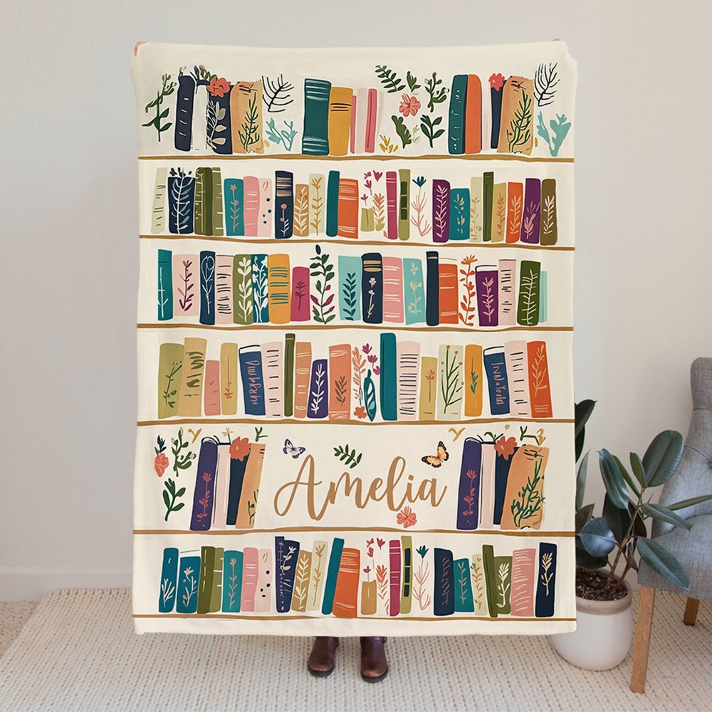 Con una colorida estantería retro como diseño central, la estantería está llena de libros adornados con plantas y flores, creando una sensación vibrante y natural. Hay disponibles nombres personalizables, que transforman una manta corriente en un "símbolo libresco" único para los amantes de los libros.